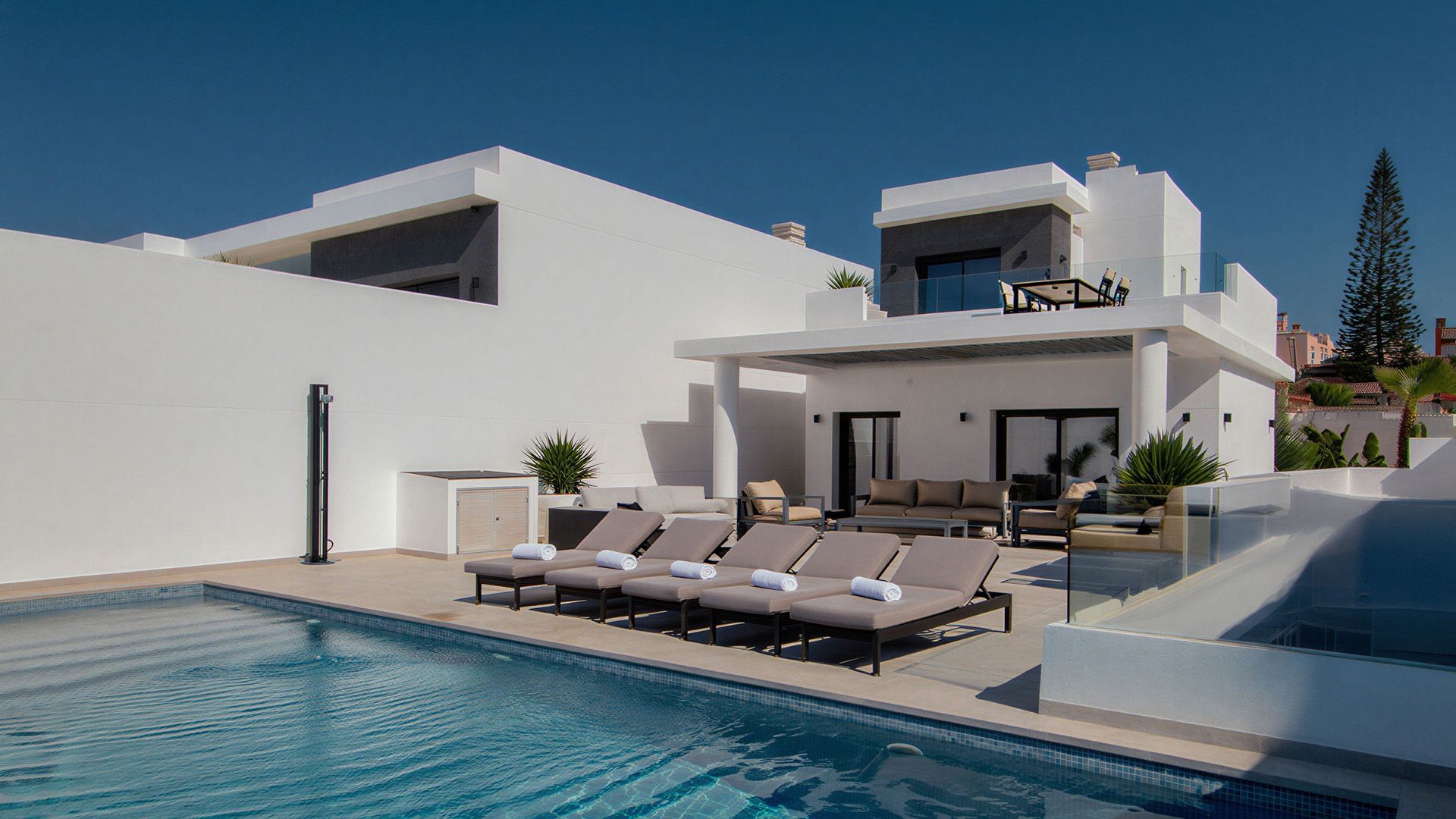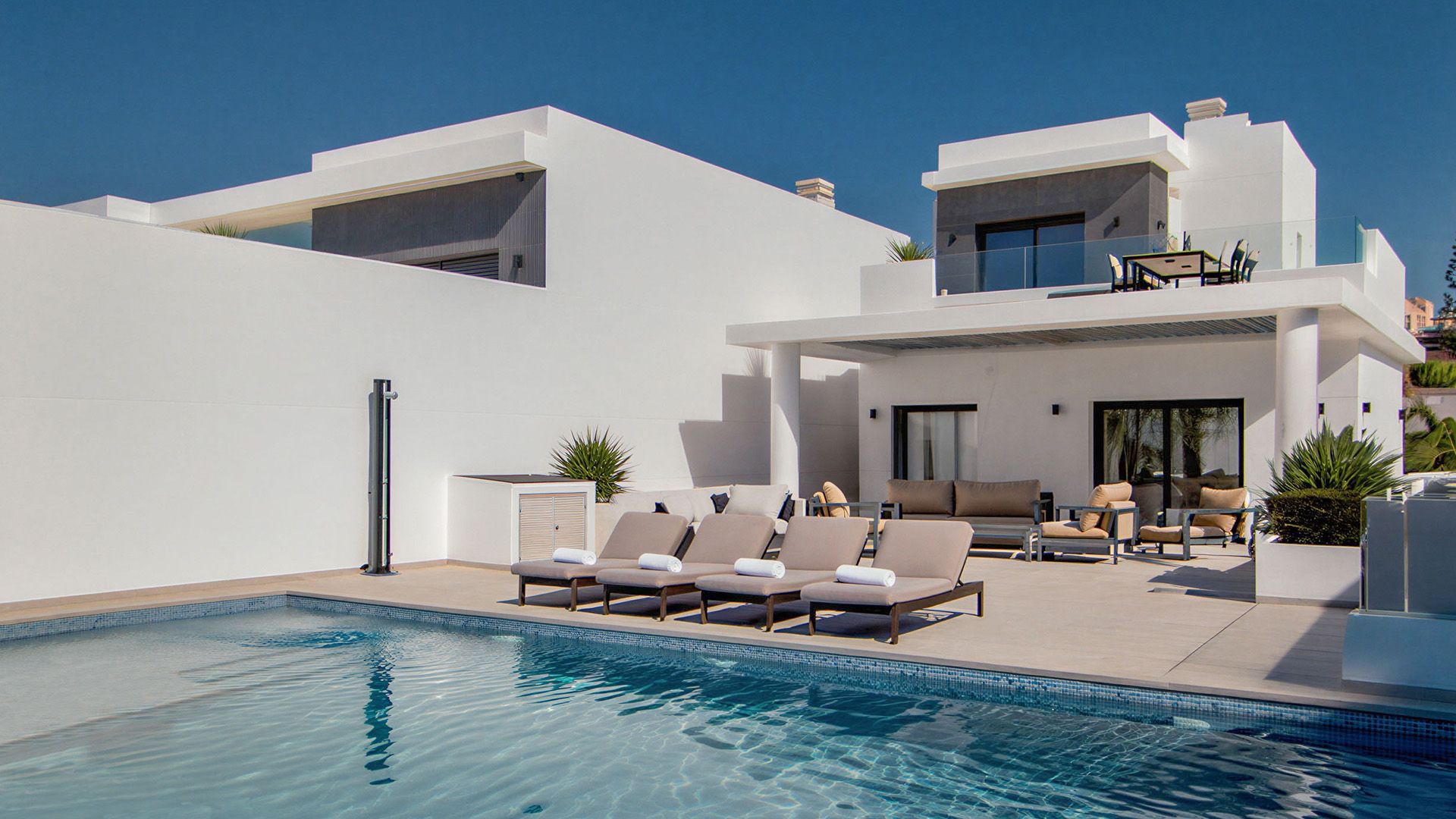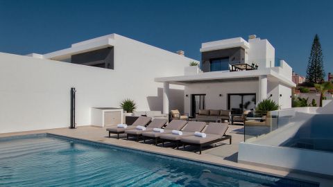 Elegant 245 m² corner villa with 4 beds and 4 baths across 3 levels. Bright living and dining areas open to sunny terraces and a large private pool. Bedrooms and a cozy second lounge sit in the underbuild. The master suite enjoys its own floor with a private terrace and panoramic views. Located in exclusive Quesada, near La Marquesa Golf, sports clubs, and Blue Flag beaches. This contemporary home offers comfort, luxury, and Mediterranean charm.
